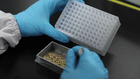 在湖南長沙的岳麓山種業(yè)創(chuàng)新中心,分子育種實(shí)驗(yàn)室研究員李樂正在把脫殼的水稻種子放進(jìn)樣品盤里,隨后將樣品放置在全自動移液工作站上,進(jìn)行樣品DNA的提取。該樣品是一份田間試驗(yàn)的低鎘水稻種子,這是岳麓山種業(yè)創(chuàng)新中心受種業(yè)企業(yè)委托選育的品種。