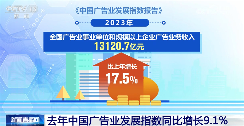 《中國廣告業(yè)發(fā)展指數(shù)報告》顯示,我國廣告業(yè)規(guī)??焖偬嵘?,產(chǎn)業(yè)活力不斷釋放。2023年,全國廣告業(yè)事業(yè)單位和規(guī)模以上企業(yè)廣告業(yè)務收入13120.7億元,比上年增長17.5%,廣告市場規(guī)模占全球比重進一步提高,繼續(xù)穩(wěn)居世界第二。