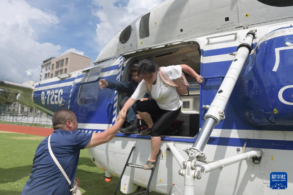 救援直升機將廣東省梅州市平遠(yuǎn)縣泗水鎮(zhèn)大新村的村民轉(zhuǎn)移到縣城(6月19日攝)。新華社記者 盧漢欣 攝