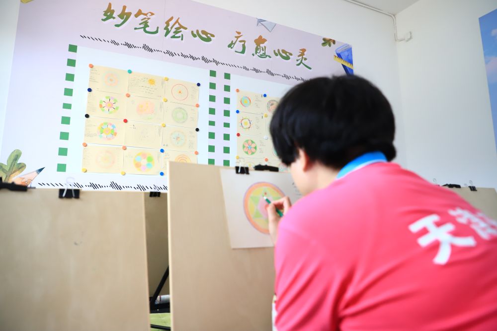 小雪在天津市青泊洼強(qiáng)制隔離戒毒所心理矯治中心繪畫治療室進(jìn)行繪畫治療。新華社發(fā)