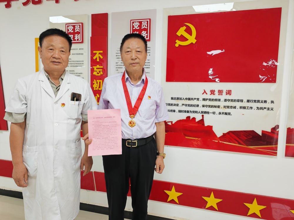 西安市高陵區(qū)醫(yī)院退休黨支部書記杜軍政為李長海(右)頒發(fā)“光榮在黨50年”紀(jì)念章。新華社記者李亞楠 攝