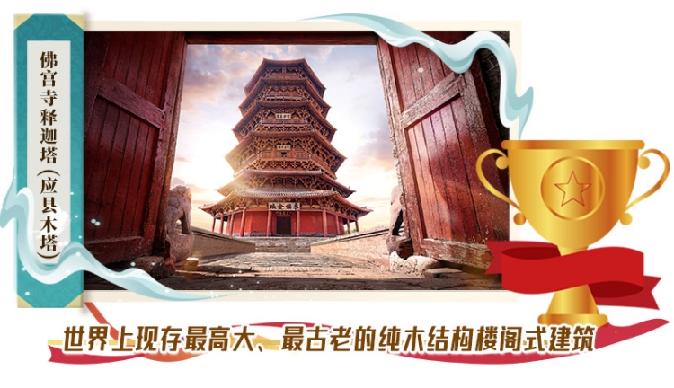應(yīng)縣木塔建于遼清寧二年(公元1056年),與意大利比薩斜塔、法國(guó)巴黎埃菲爾鐵塔并稱“世界三大奇塔”。采用純木結(jié)構(gòu)搭建,全塔無(wú)釘無(wú)鉚。全塔使用的斗拱形式達(dá)50余種,有“斗拱博物館”之稱。
