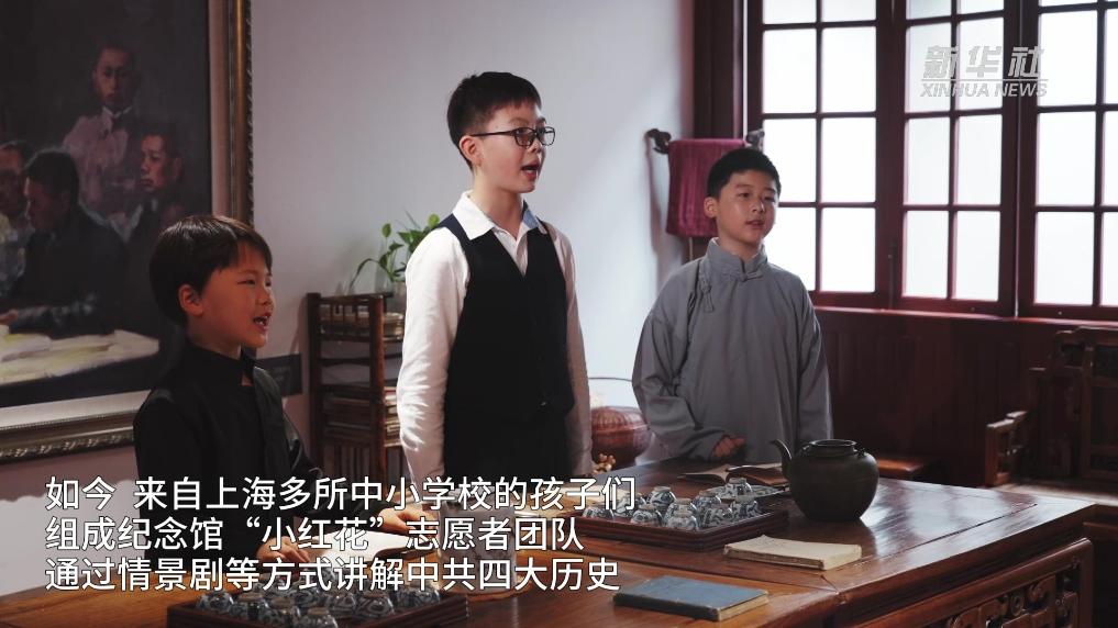 紀(jì)念館場(chǎng)景再現(xiàn)廳還原了當(dāng)年廣吉里的會(huì)議場(chǎng)景:一塊寫(xiě)著英文的黑板,長(zhǎng)條桌邊圍著一圈木凳。如今,這個(gè)場(chǎng)景成為“紅色課堂”,來(lái)自上海多所中小學(xué)校的孩子們組成紀(jì)念館“小紅花”志愿者團(tuán)隊(duì),通過(guò)情景劇等方式,講解中共四大歷史。