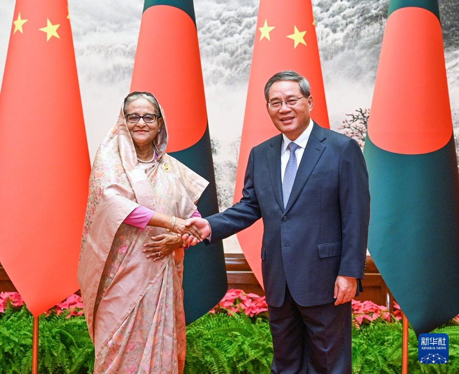 國務院總理李強7月10日上午在北京人民大會堂同來華進行正式訪問的孟加拉國總理哈西娜舉行會談。