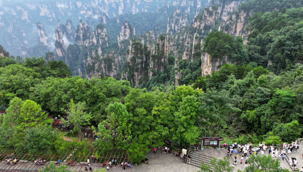 7月14日,游客在張家界國家森林公園天子山游覽(無人機(jī)照片)。新華社發(fā)(吳勇兵攝)