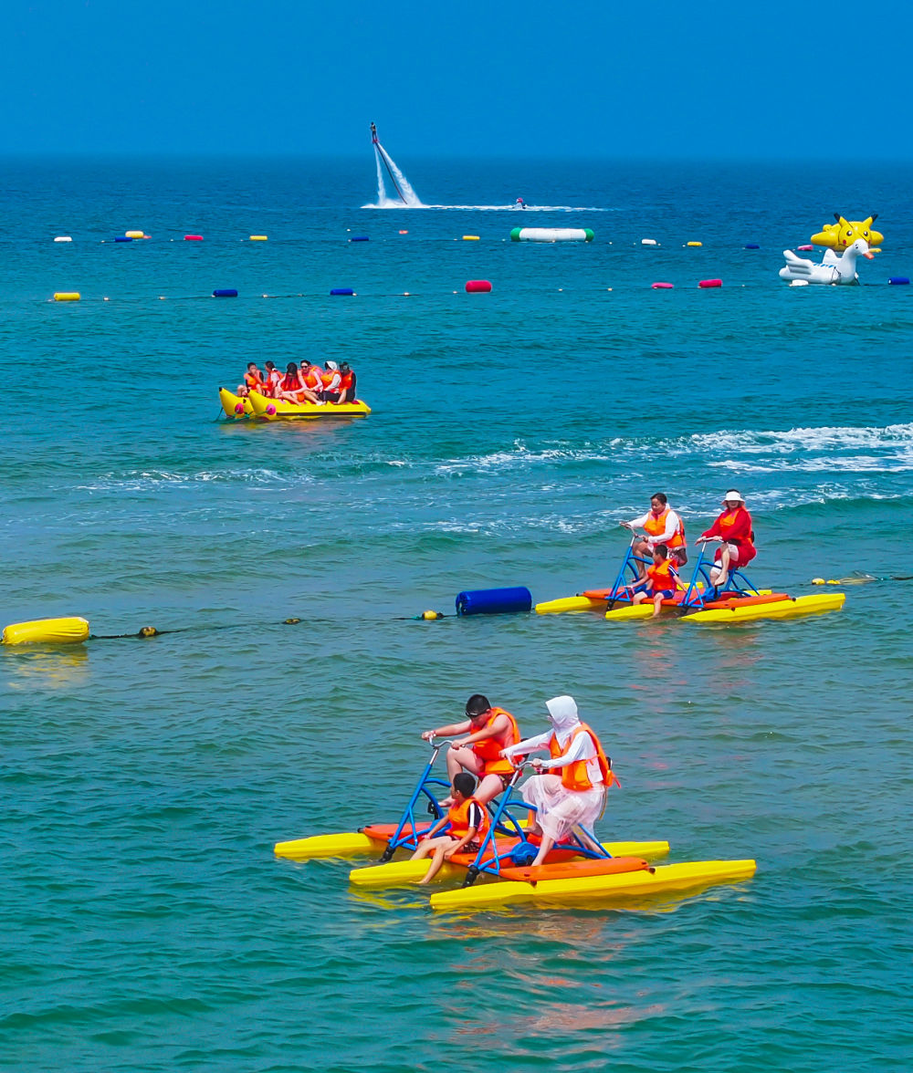7月13日,游客在山東省榮成市那香海海水浴場體驗水上娛樂項目(無人機(jī)照片)。新華社發(fā)(李信君攝)