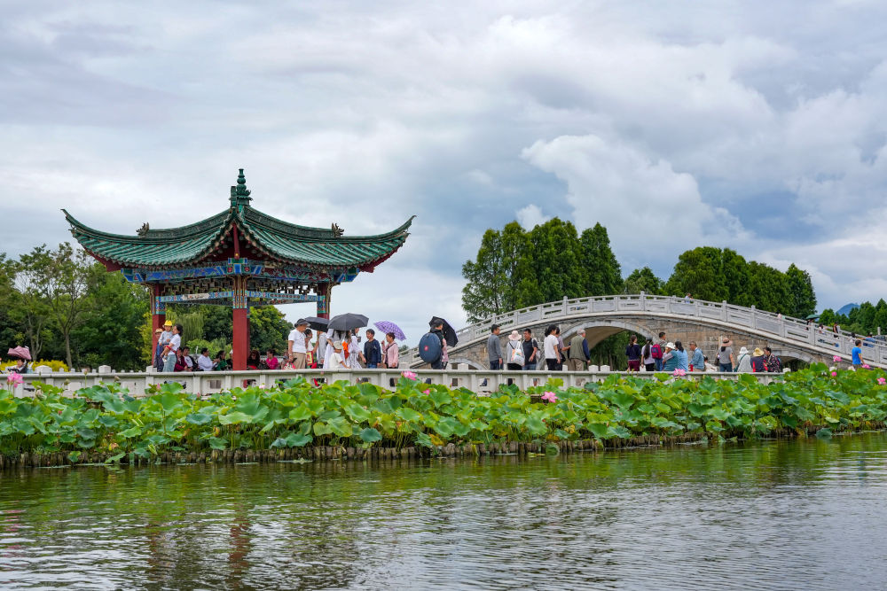 7月13日,游客在昆明市大觀公園內(nèi)觀賞荷花。新華社發(fā)(郝亞鑫攝)