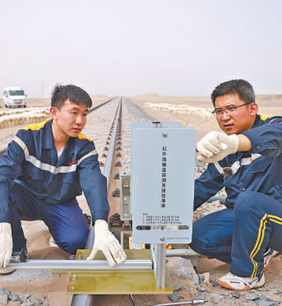 臺欣龍(右)和同事在對紅外線軸溫探測設備探頭進行方位角矯正。