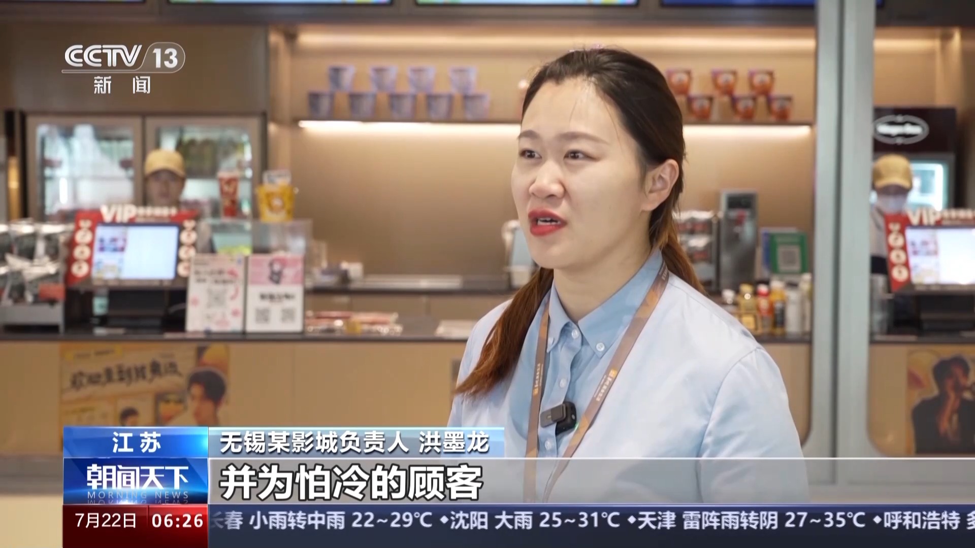 無錫某影城負(fù)責(zé)人 洪墨龍:首先我們保證影廳的溫度適宜,并為怕冷的顧客提供免費(fèi)干凈的毛毯。我們還會通過現(xiàn)場的陳列布置,打造主題觀影氛圍,讓觀眾在觀影過程中有更多的參與感和互動體驗(yàn)。