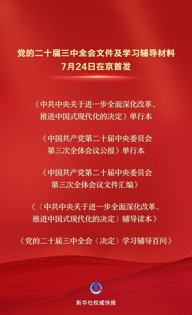 黨的二十屆三中全會(huì)文件及學(xué)習(xí)輔導(dǎo)材料7月24日在京首發(fā)