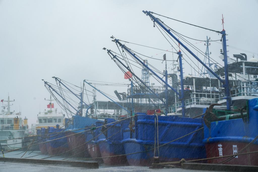 7月25日下午,在位于福建省莆田市秀嶼區(qū)埭頭鎮(zhèn)的石城國家一級漁港,今年第3號(hào)臺(tái)風(fēng)“格美”的外圍風(fēng)圈已經(jīng)襲來。七八級的陣風(fēng)夾雜著豆大的雨點(diǎn)打在臉上,裹挾著三四米高的海浪拍擊著護(hù)堤,激起白茫茫一片水花。漁港里,100多艘大小船舶已在24日中午12點(diǎn)前回港,呈“半月環(huán)抱”狀整齊停泊,船舶間已用纜繩加固。