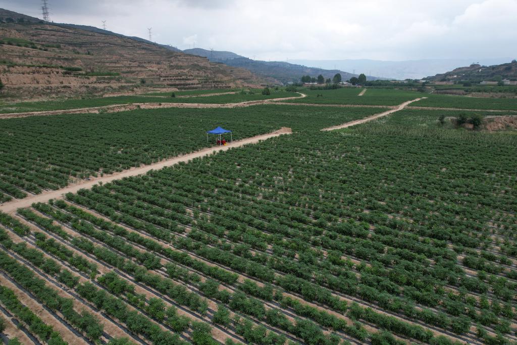 這是在天水市甘谷縣新興鎮(zhèn)侯家溝村拍攝的辣椒生產基地(無人機照片)。新華社記者 范培珅 攝