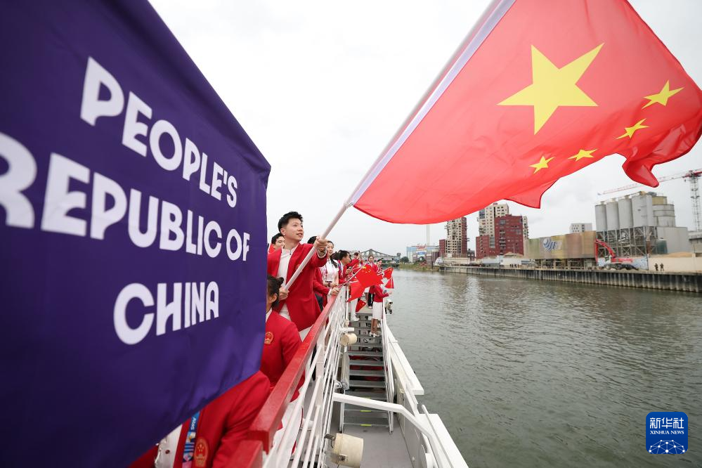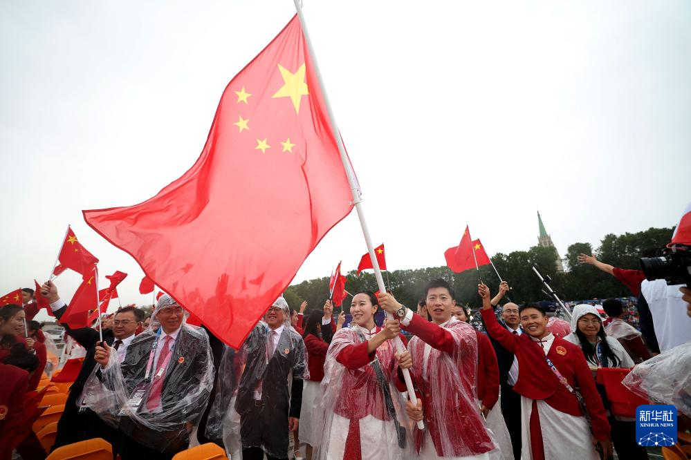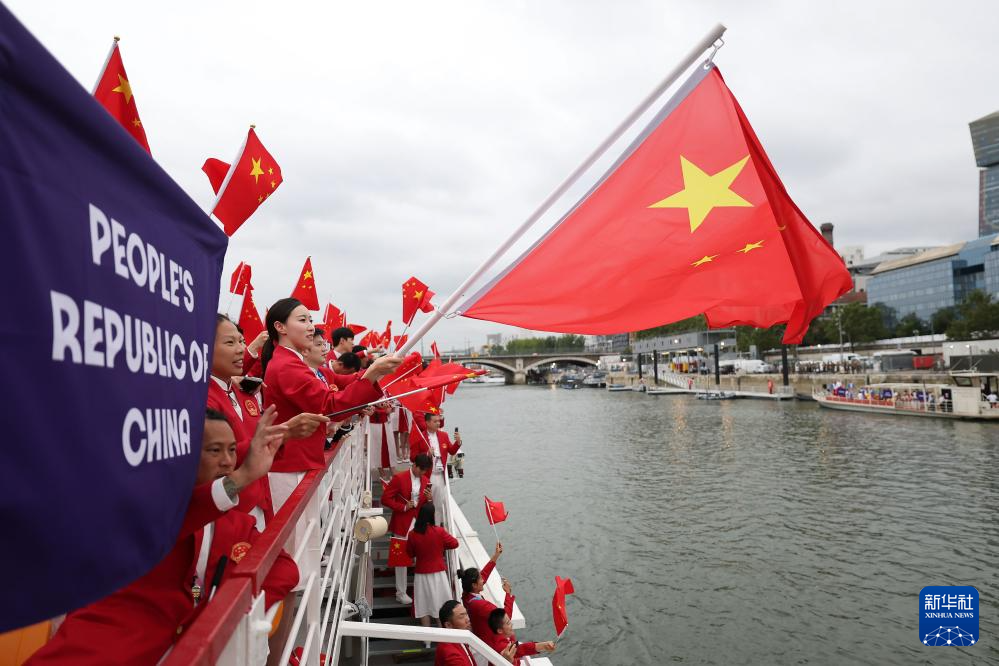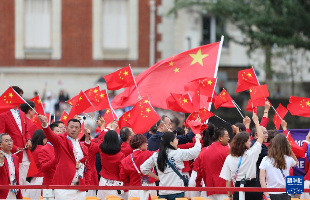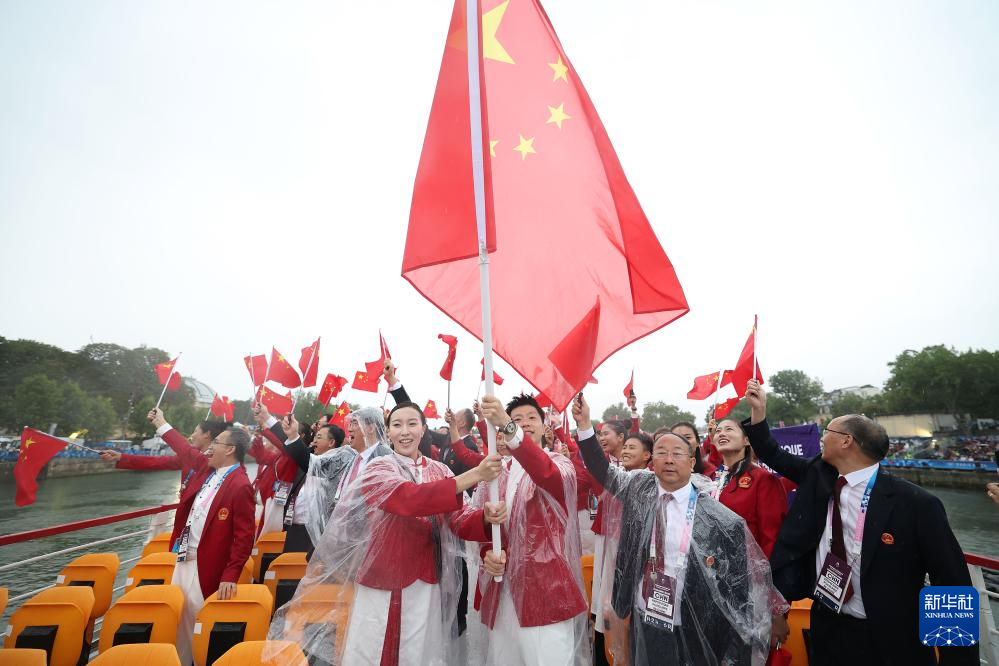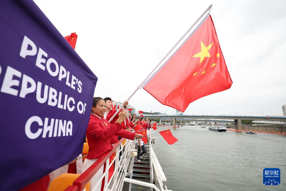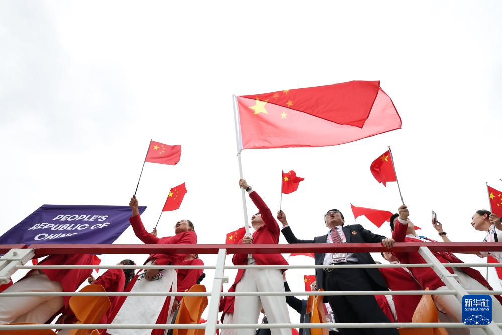 7月26日,中國體育代表團(tuán)旗手、花樣游泳選手馮雨在開幕式上揮舞國旗。新華社記者 曹燦 攝