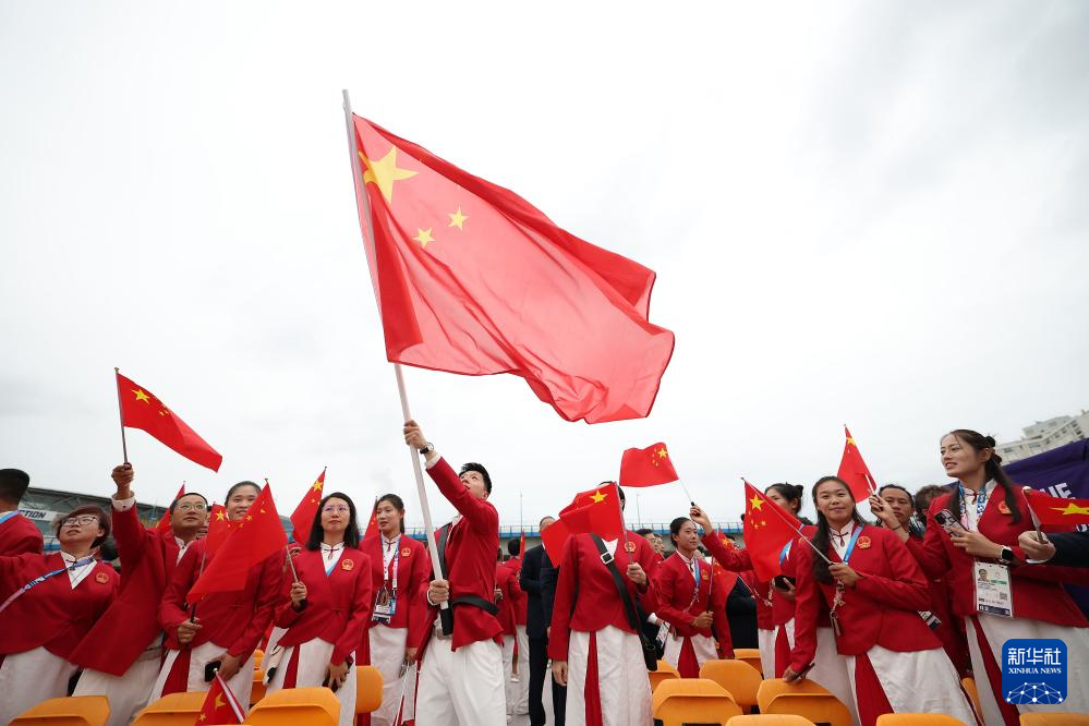 7月26日,中國體育代表團(tuán)在開幕式上。新華社記者 郭昱 攝