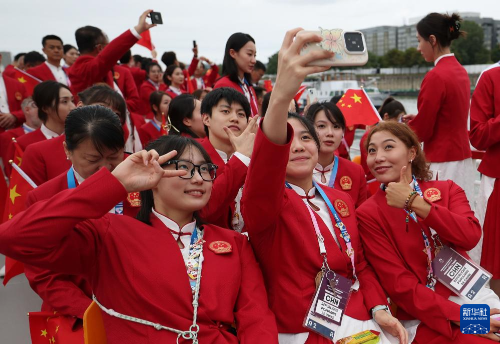 7月26日,中國體育代表團(tuán)成員在開幕式前自拍留影。新華社記者 曹燦 攝