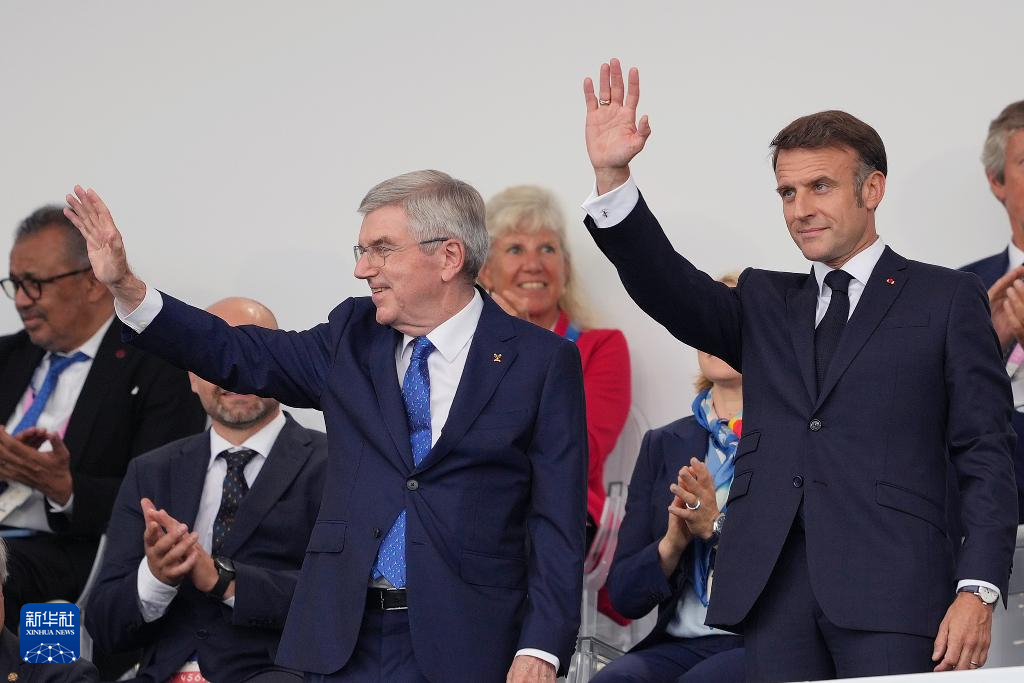 7月26日,國際奧委會(huì)主席巴赫(前左)與法國總統(tǒng)馬克龍(前右)出席開幕式。新華社記者 王毓國 攝