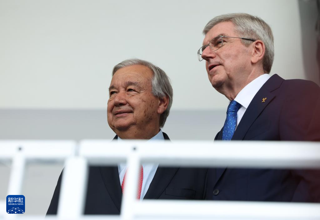 7月26日,國際奧委會(huì)主席巴赫(右)與聯(lián)合國秘書長古特雷斯出席開幕式。新華社記者 高靜 攝pagebreak