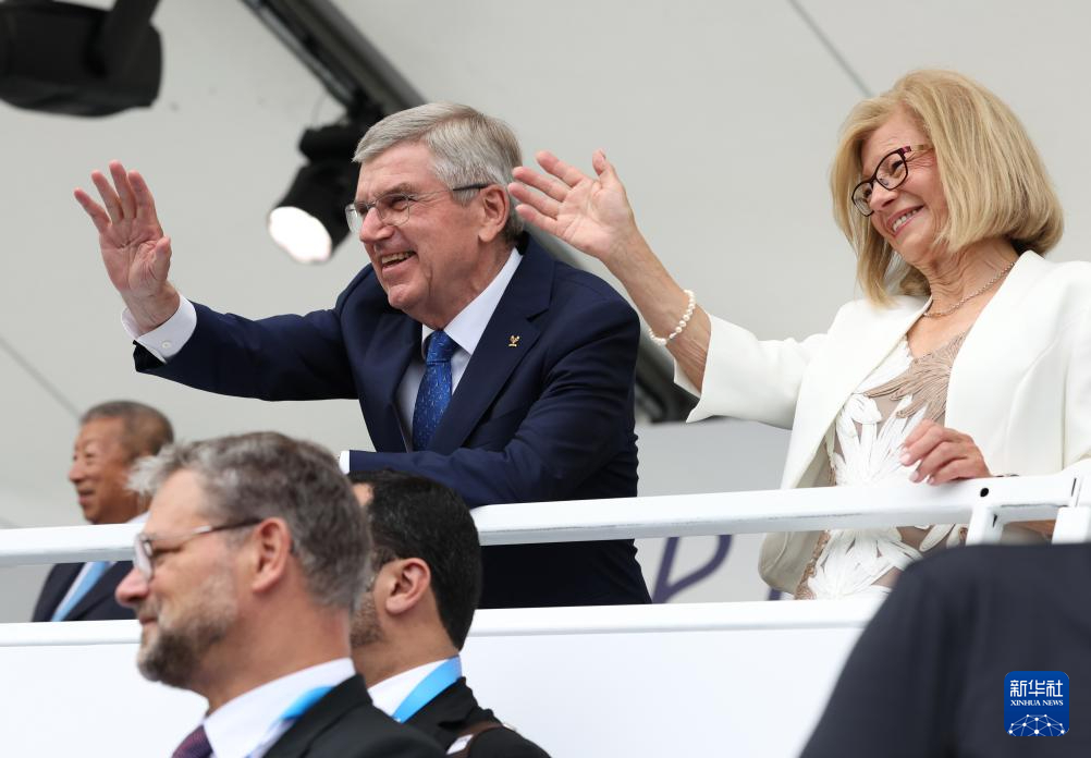7月26日,國際奧委會(huì)主席巴赫(中上)在開幕式現(xiàn)場向觀眾致意。新華社記者 高靜 攝