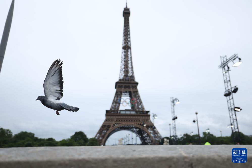 7月26日,一只鴿子在埃菲爾鐵塔前飛過。新華社記者 李明 攝