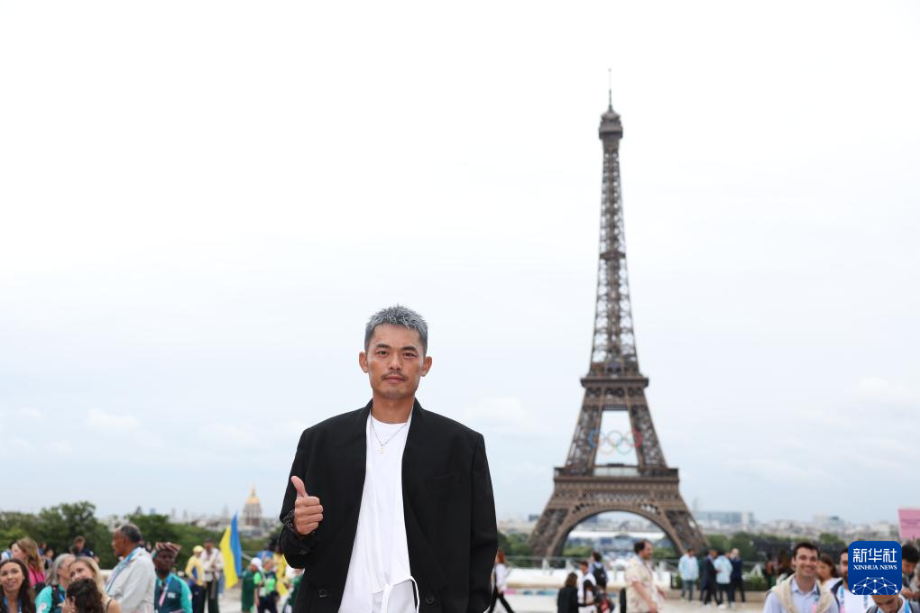 7月26日,中國體育代表團(tuán)旗手、乒乓球選手馬龍?jiān)诎7茽栬F塔前。新華社記者 李明 攝
