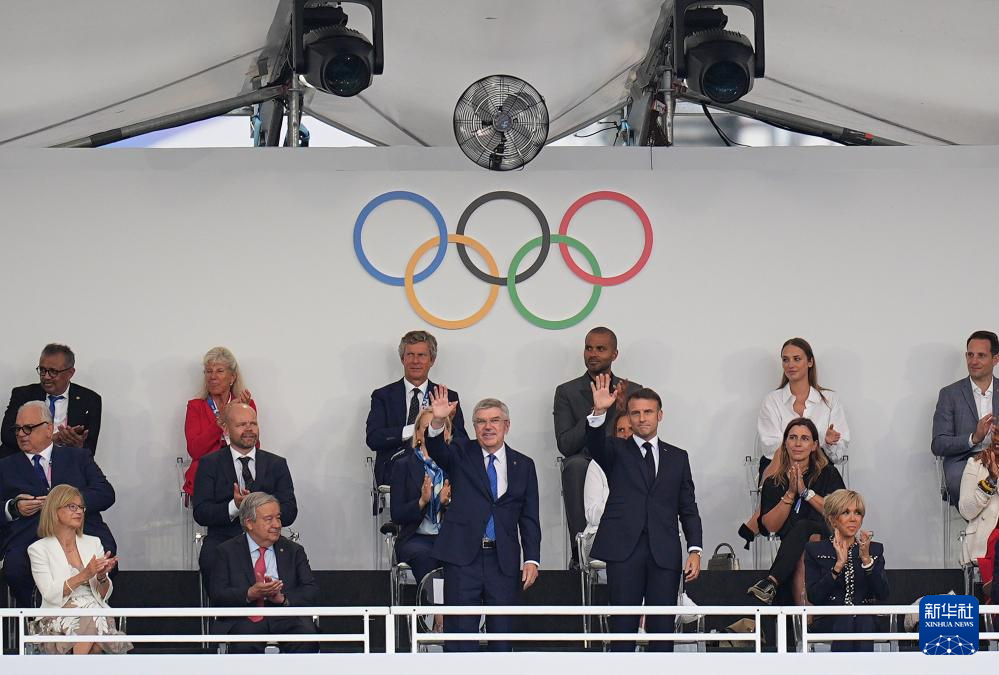 7月26日,國際奧委會(huì)主席巴赫(上左)和法國總統(tǒng)馬克龍出席開幕式。新華社記者 高靜 攝
