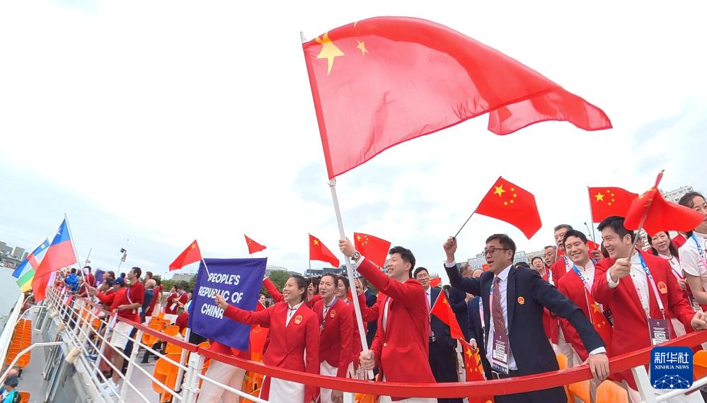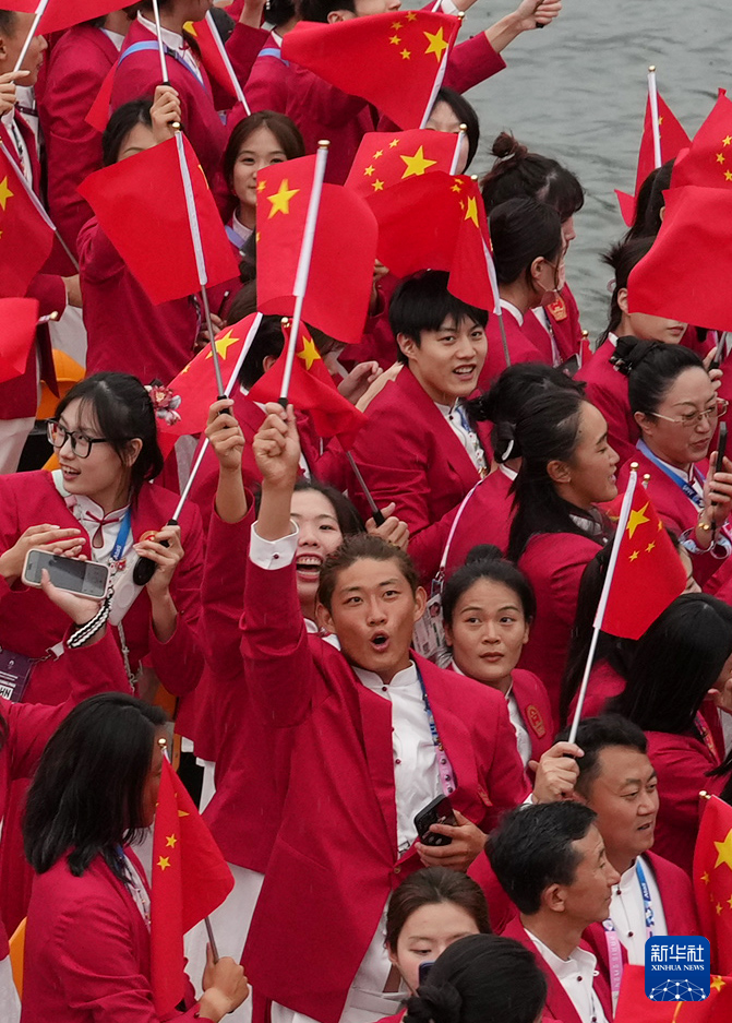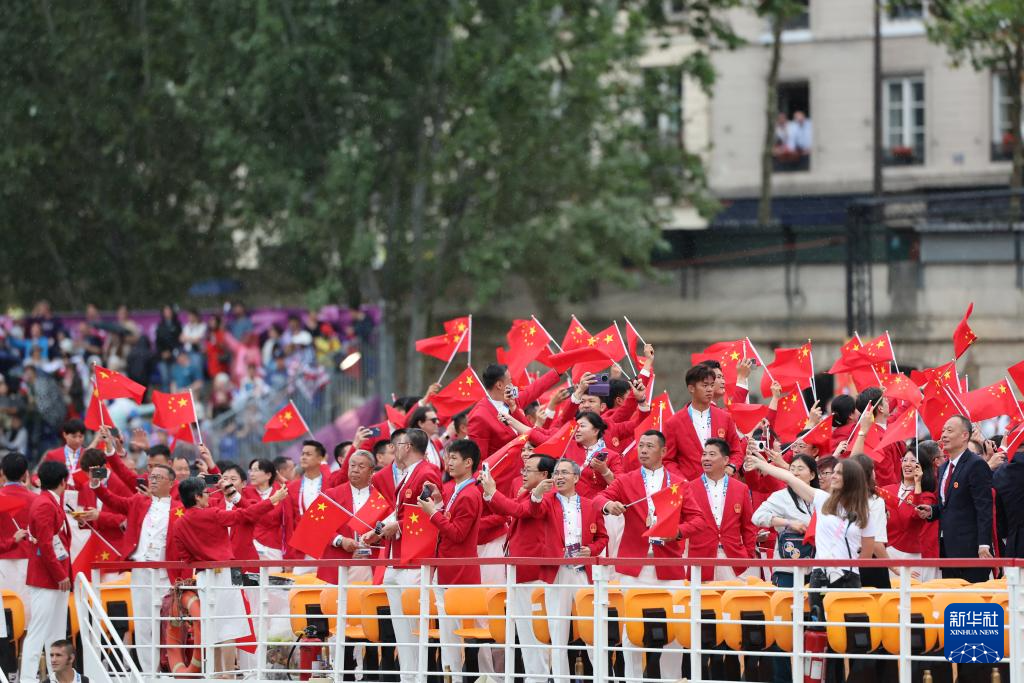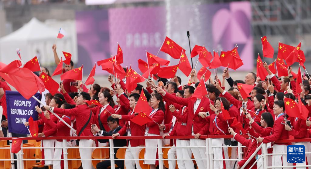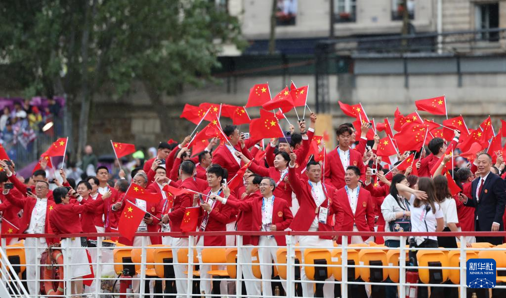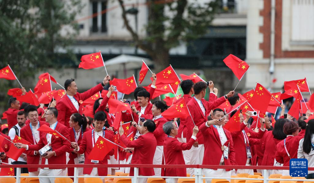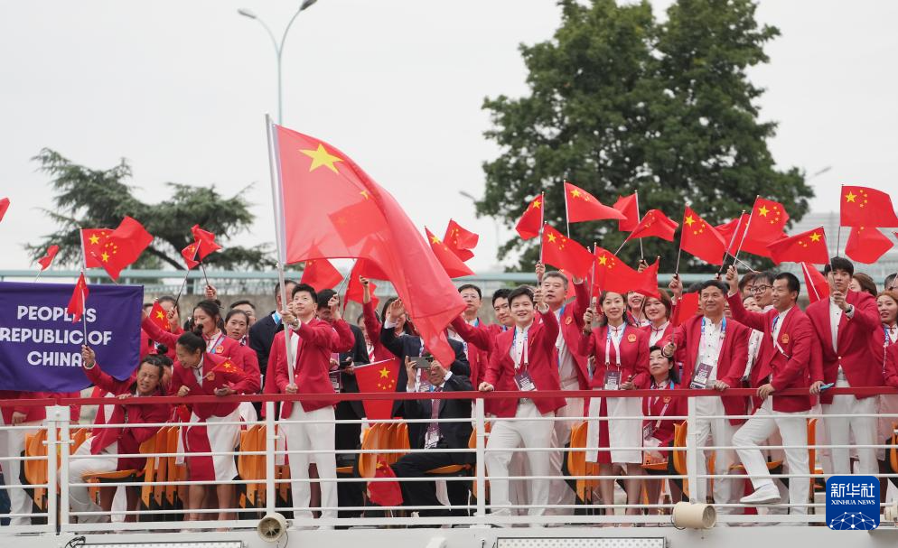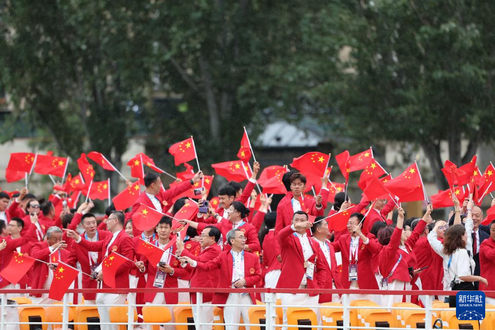 7月26日,中國體育代表團(tuán)成員在開幕式現(xiàn)場。新華社記者 王毓國 攝