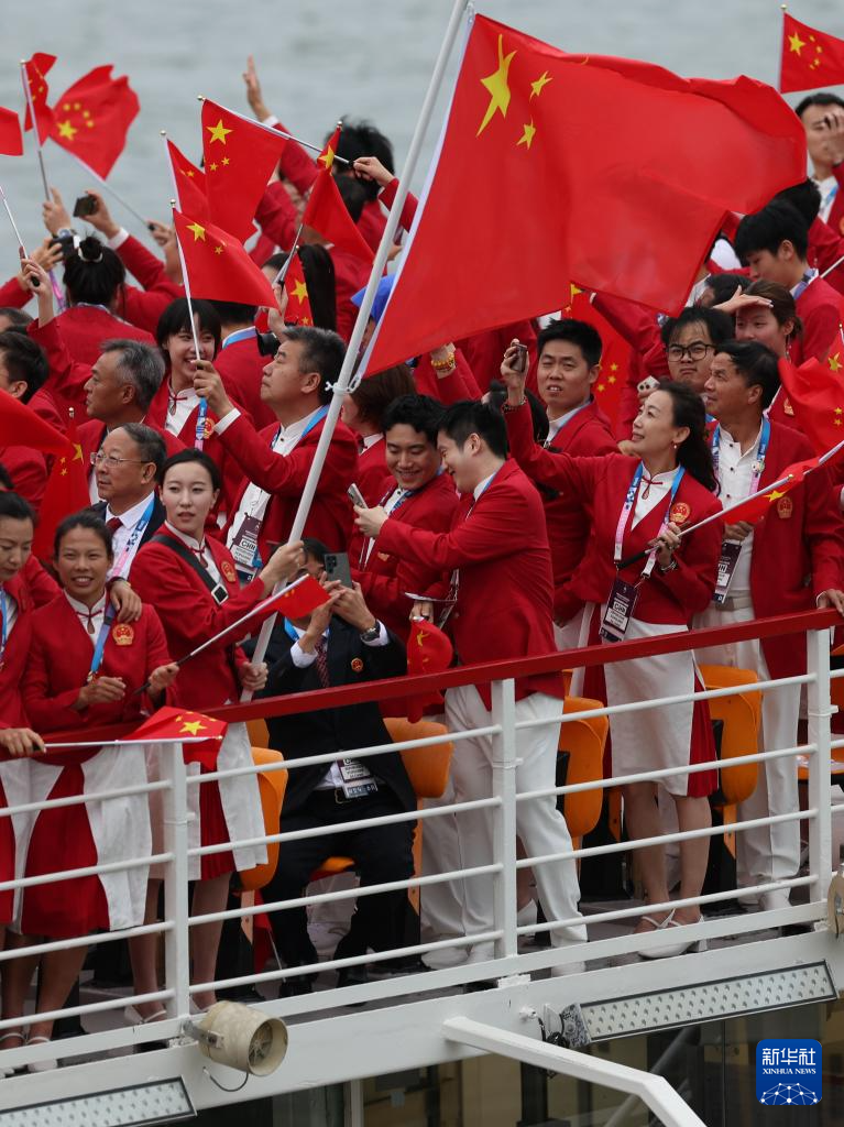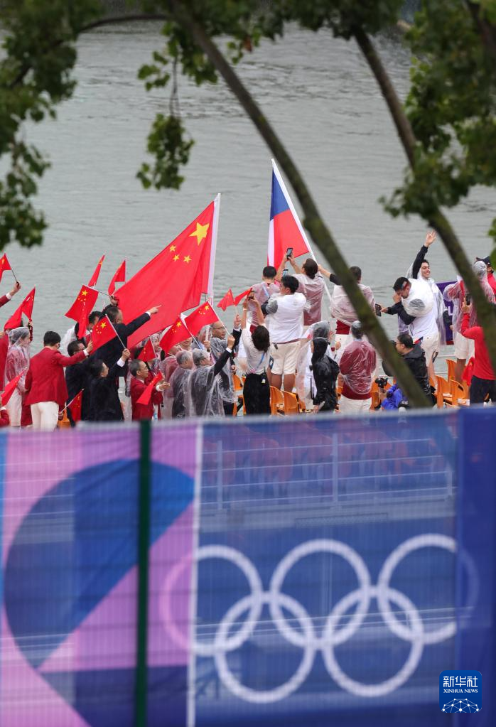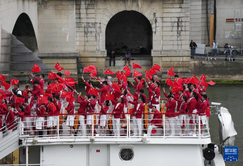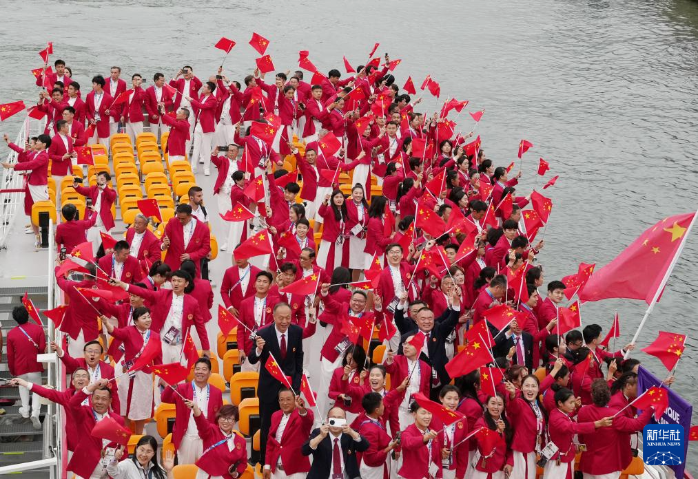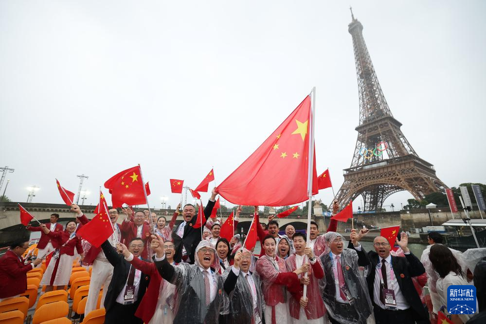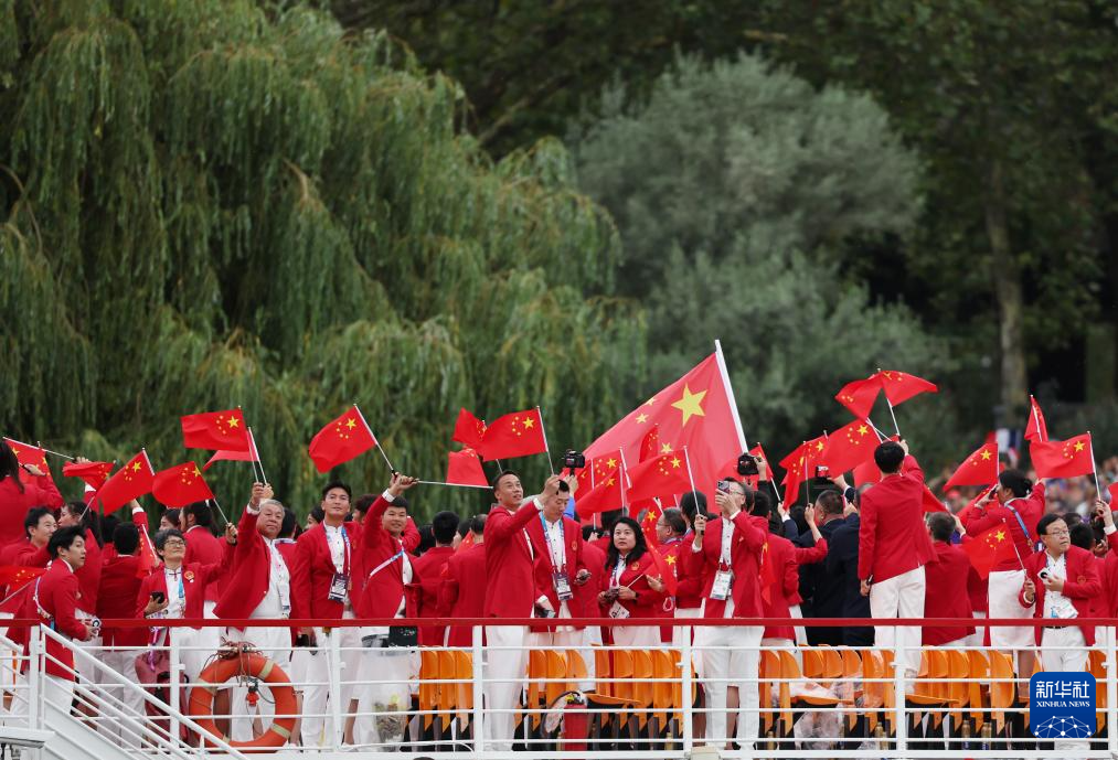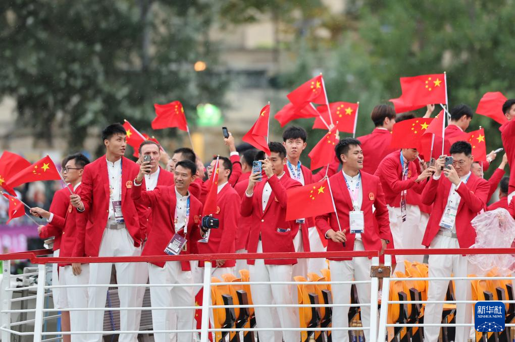 7月26日,中國體育代表團(tuán)成員在開幕式現(xiàn)場。新華社記者 王毓國 攝