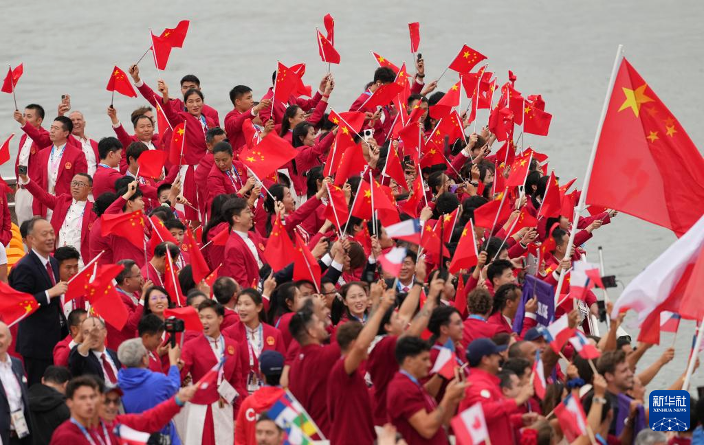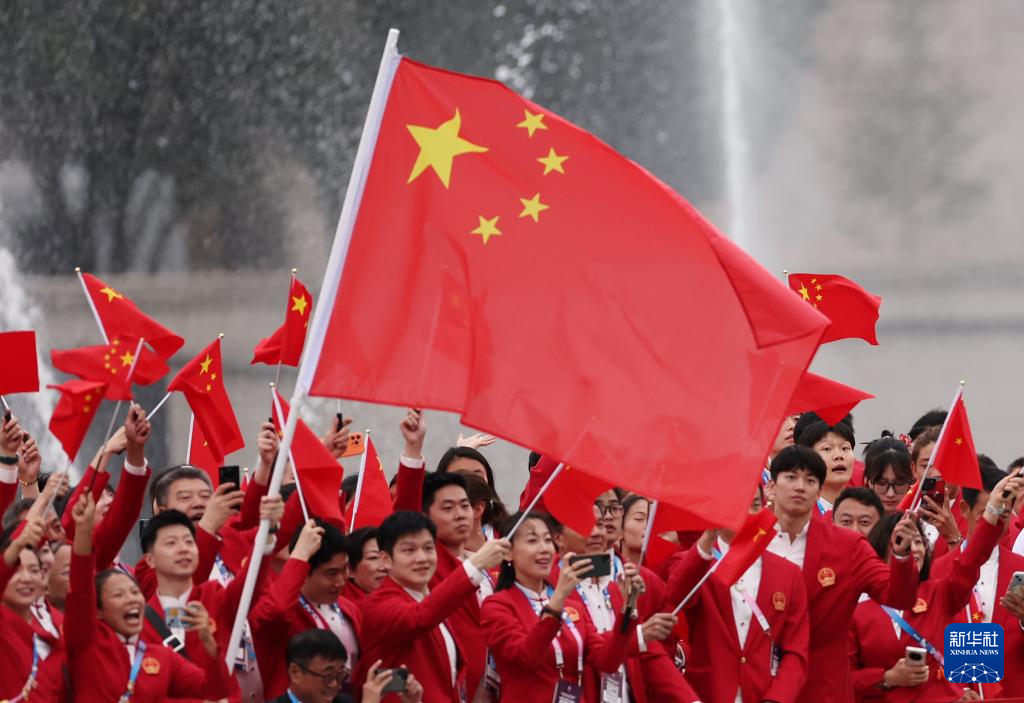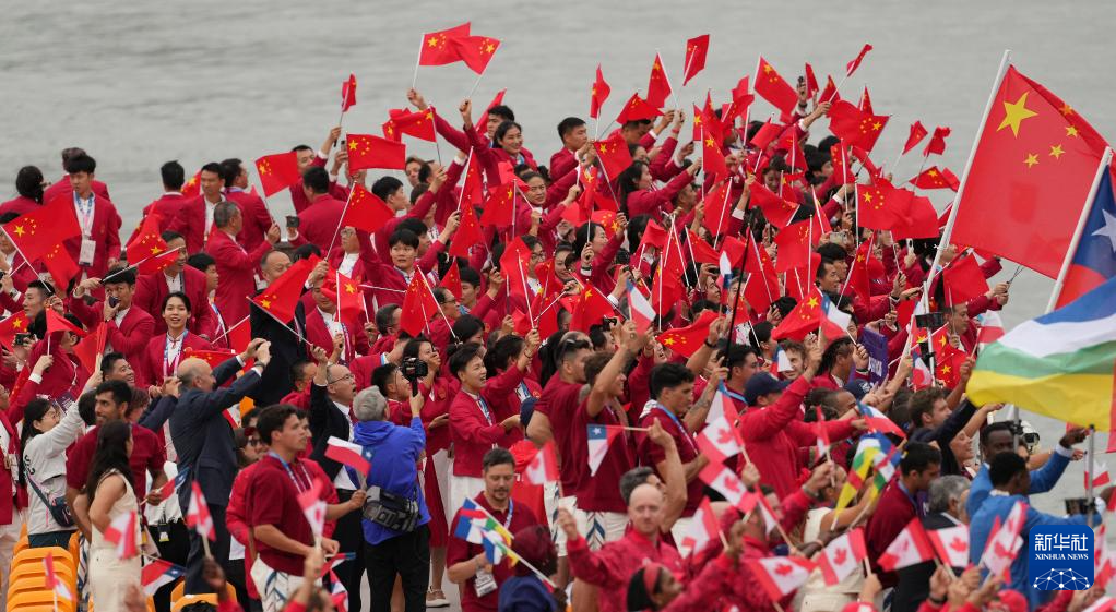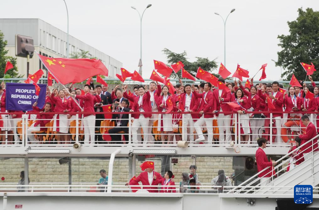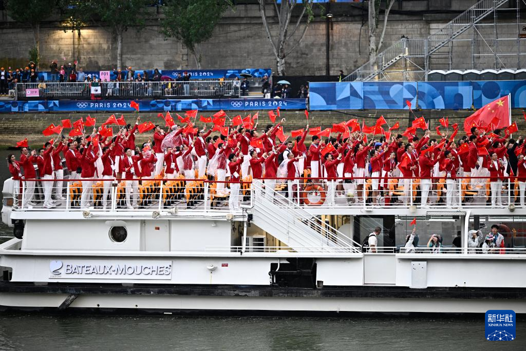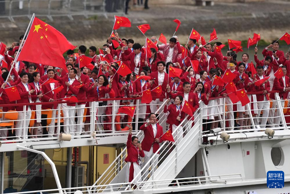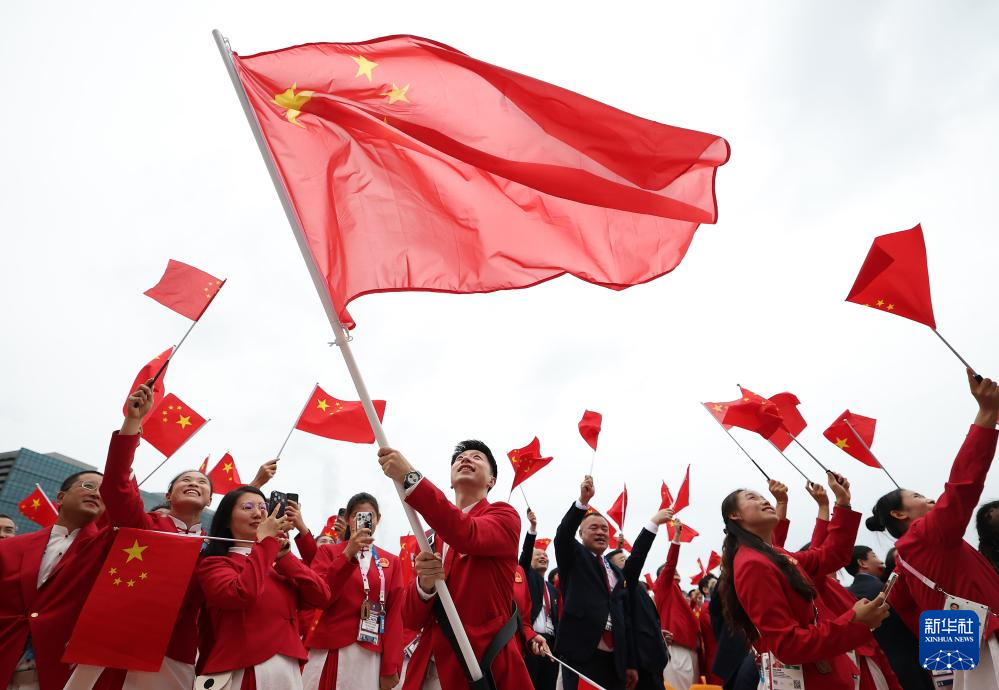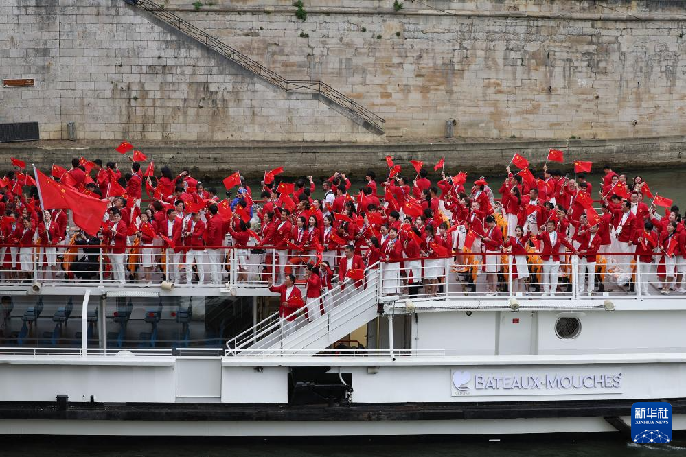 7月26日,中國體育代表團(tuán)成員在開幕式現(xiàn)場。新華社記者 王毓國 攝