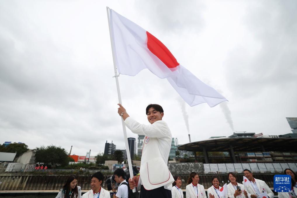 7月26日,日本體育代表團(tuán)旗手、霹靂舞運(yùn)動(dòng)員半井重幸在開幕式上揮舞國旗。新華社發(fā)(POOL照片/邁克爾·里夫斯)pagebreak