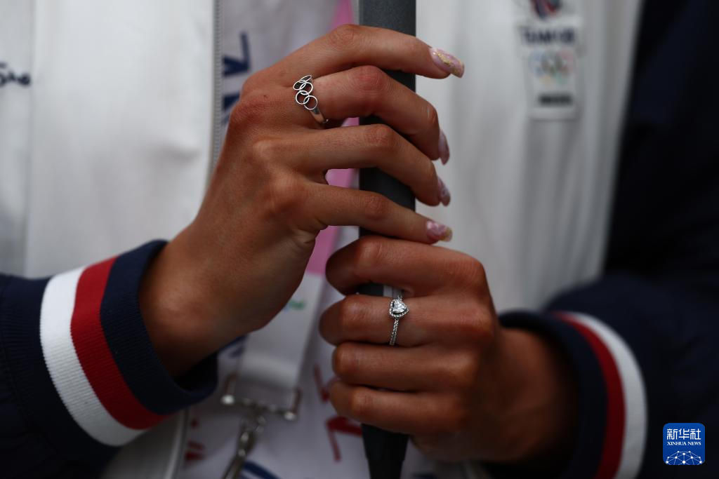 這是7月26日拍攝的一名英國體育代表團(tuán)成員佩戴的有奧運(yùn)五環(huán)元素的戒指。新華社發(fā)(POOL照片/娜奧米·貝克)