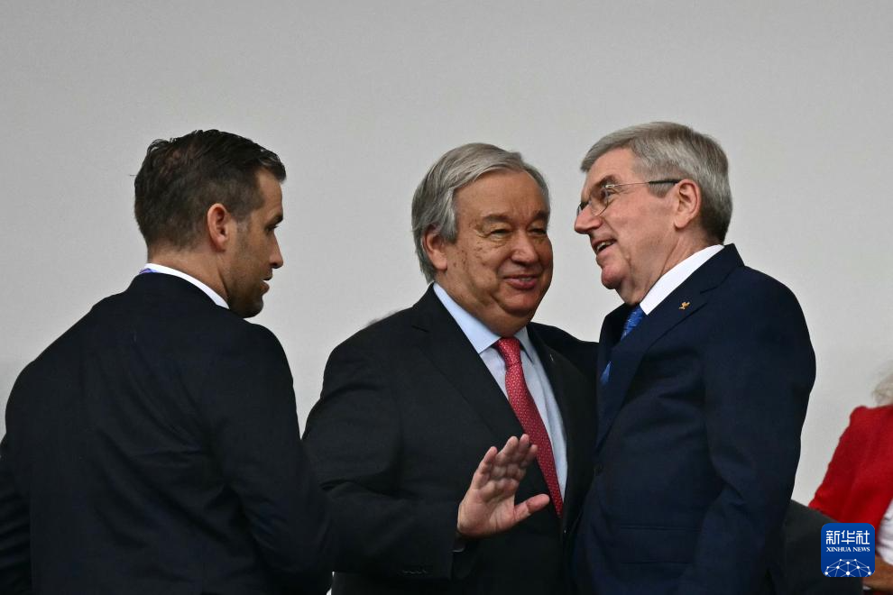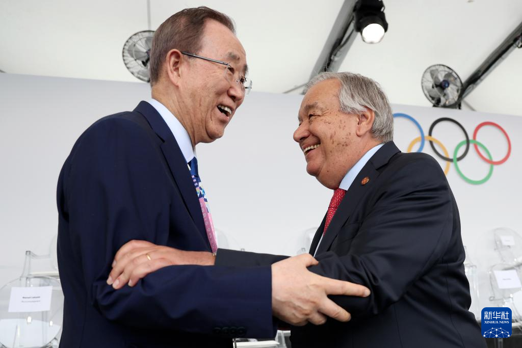 7月26日,聯(lián)合國秘書長古特雷斯(右)與聯(lián)合國前秘書長潘基文在開幕式前致意。新華社發(fā)(POOL照片/帕斯卡爾·勒·塞格雷坦)