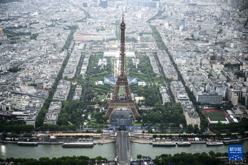 俯瞰開幕式上的埃菲爾鐵塔和戰(zhàn)神廣場(7月26日攝)。新華社發(fā)(POOL照片/利昂內(nèi)爾·博納旺蒂爾)