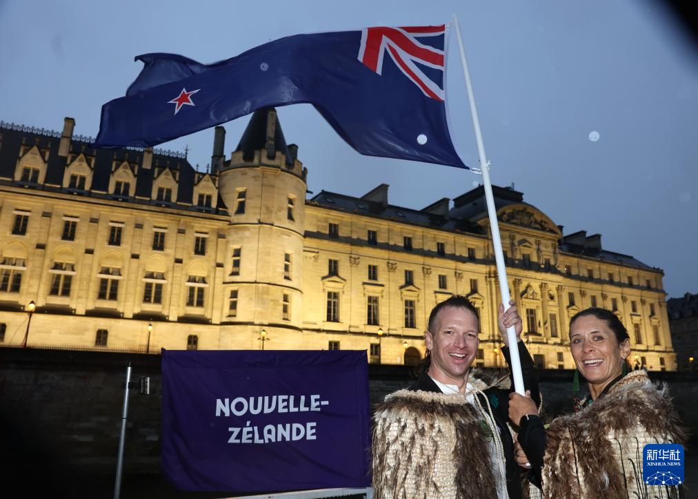 7月26日,新西蘭體育代表團(tuán)旗手阿倫·默里·蓋特(左)與橋·阿萊在開幕式上揮舞國旗。新華社發(fā)(POOL照片/漢娜·皮特斯)