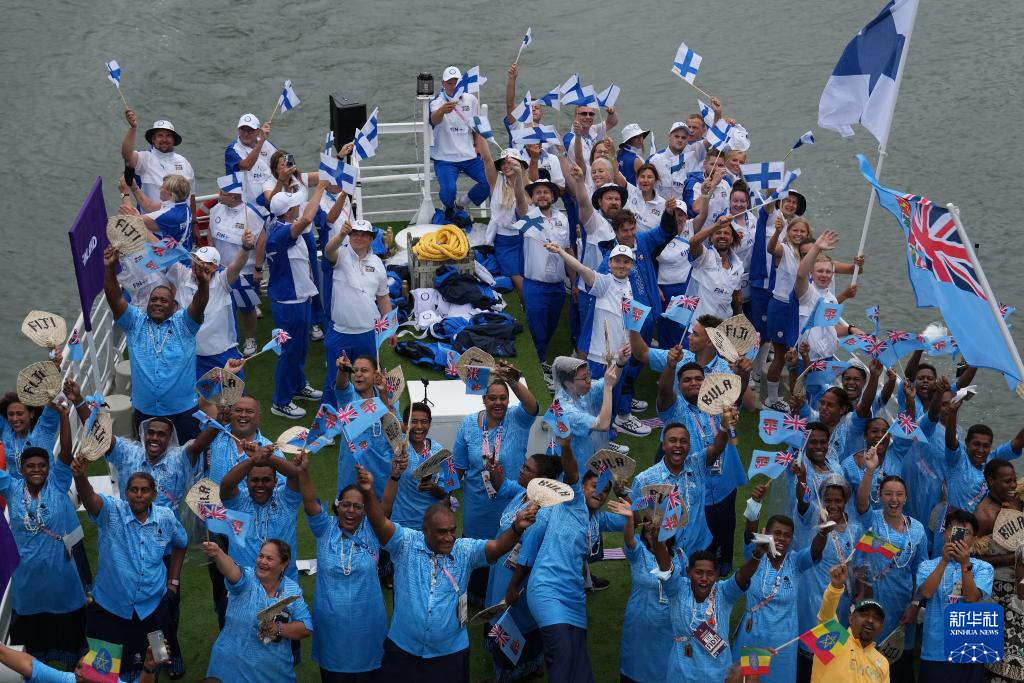 7月26日,芬蘭體育代表團(tuán)(上)與斐濟(jì)體育代表團(tuán)在開幕式上。新華社記者 萬象 攝