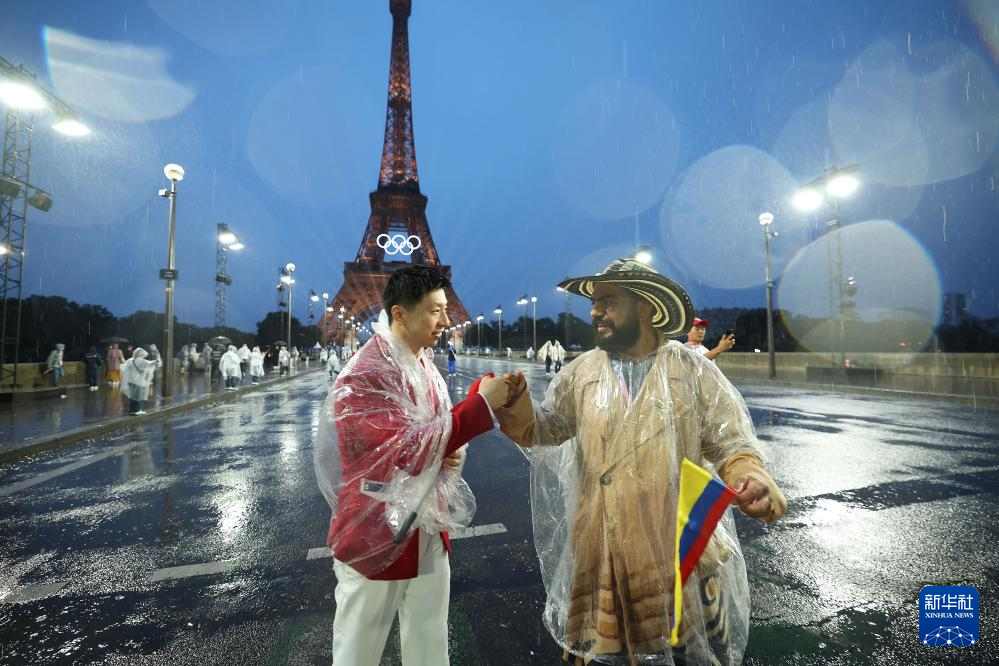 7月26日,中國體育代表團(tuán)旗手、乒乓球選手馬龍(左)與哥倫比亞體育代表團(tuán)成員在埃菲爾鐵塔前相互致意。新華社記者 李明 攝