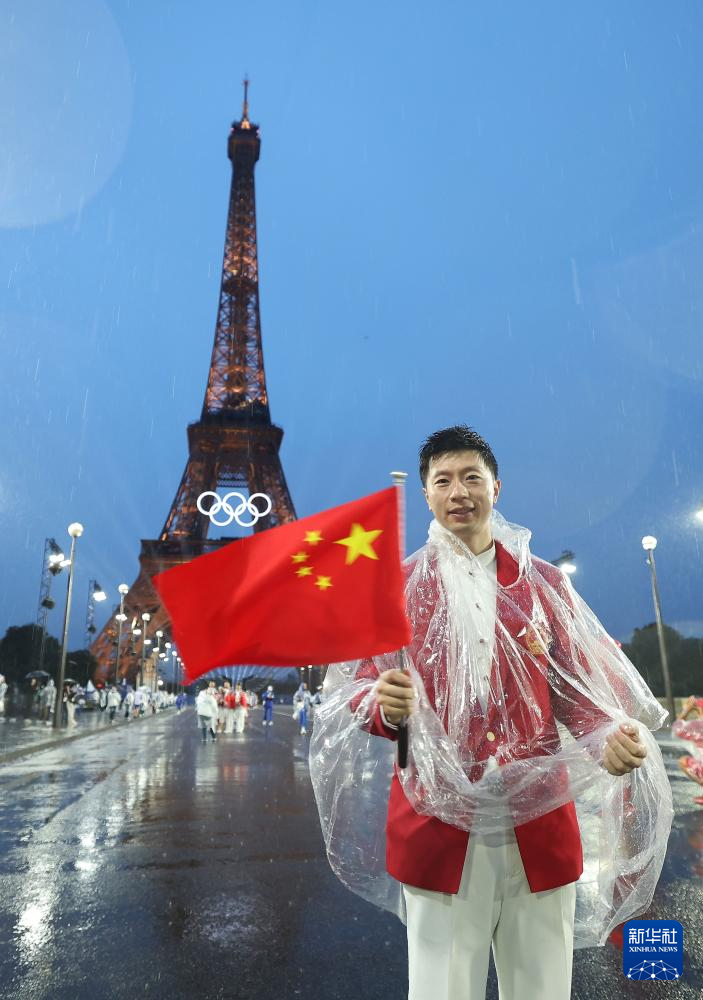 7月26日,中國體育代表團(tuán)旗手、乒乓球選手馬龍?jiān)陂_幕式前揮舞國旗。新華社記者 曹燦 攝