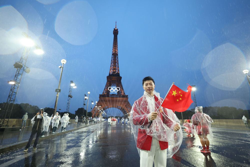當地時間7月26日,第33屆夏季奧林匹克運動會開幕式在法國巴黎舉行。乒乓球運動員馬龍、花樣游泳運動員馮雨高擎五星紅旗,中國體育代表團運動員乘船在塞納河巡游。