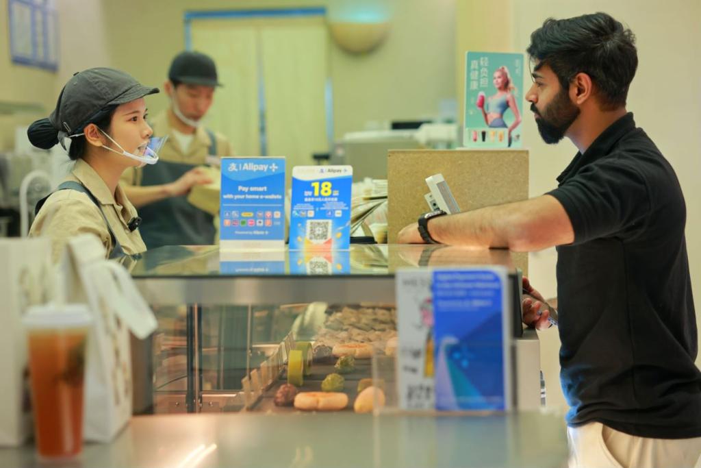 4月8日拍攝的巴基斯坦人冉納在北京藍(lán)色港灣一家飲品店用手機(jī)掃碼支付購(gòu)買商品。新華社發(fā)