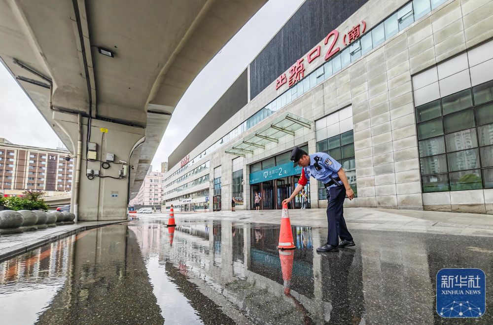 7月28日,在沈陽北站,沈陽鐵路公安處民警在出站口附近的積水處設立警示標志。 新華社發(fā)