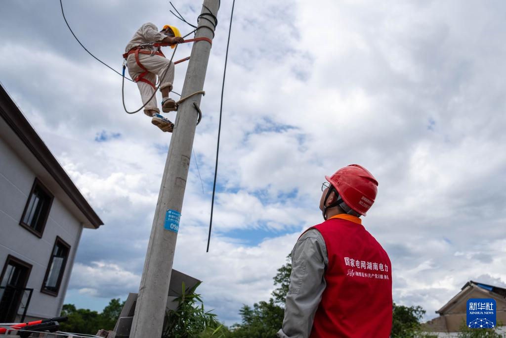 7月29日,在湖南省湘潭縣易俗河鎮(zhèn)四新堤決口現(xiàn)場,搶險(xiǎn)人員在處理決口附近的電線。新華社記者 陳思汗 攝