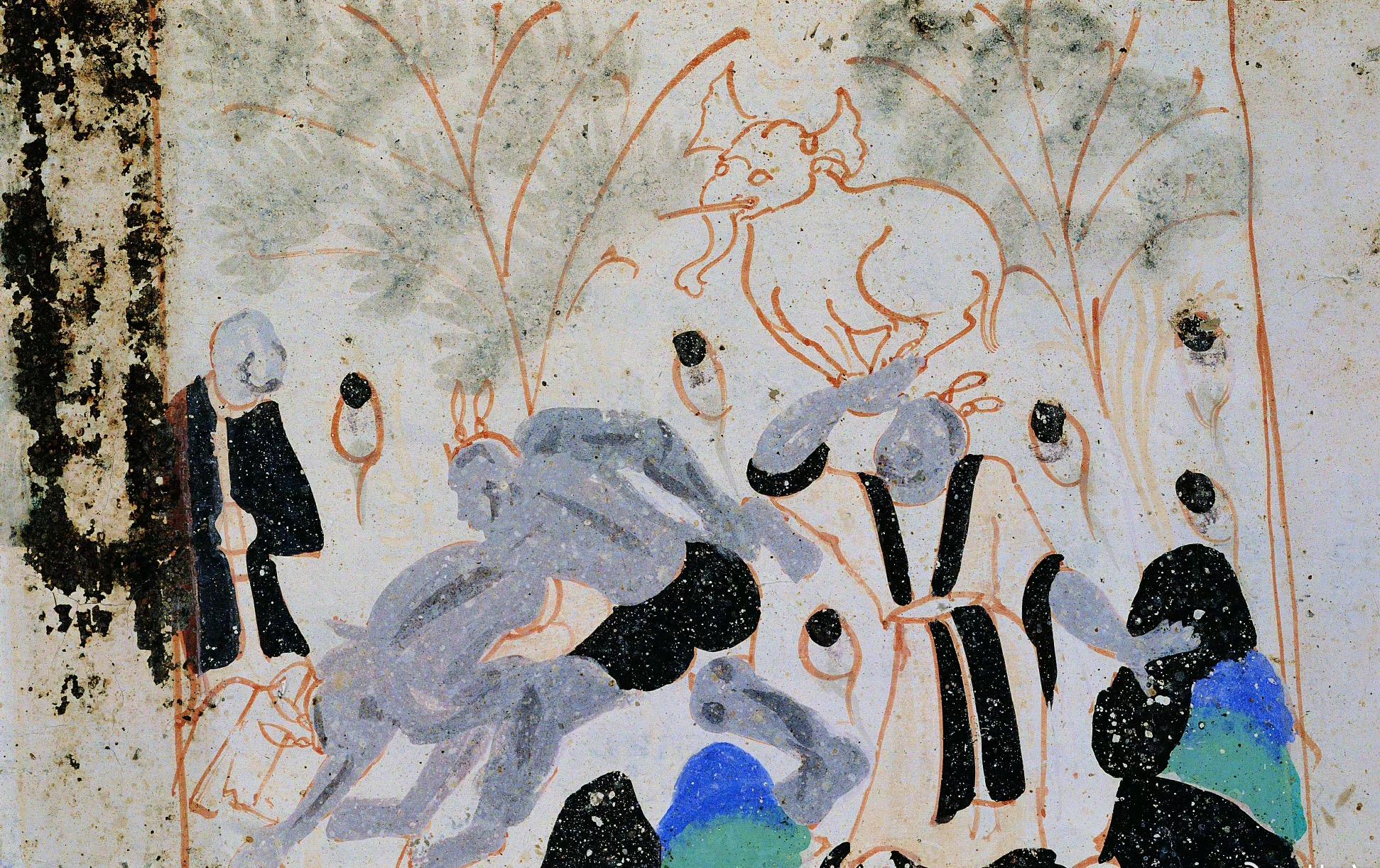 馬術(shù):敦煌壁畫中的馬術(shù)畫,以呈現(xiàn)賽馬和馬上技巧為主。莫高窟61窟中還有一幅五代時(shí)期多人于馬上進(jìn)行技巧競(jìng)賽的壁畫,在開闊的草地上,一人騎在四蹄幾乎拉直飛奔的馬上,突然離鞍從一側(cè)俯身,用手撿拾放置在地上的繩索。整個(gè)場(chǎng)面風(fēng)馳電掣,競(jìng)爭激烈,展現(xiàn)出力量與速度的完美融合。莫高窟第61窟,五代。