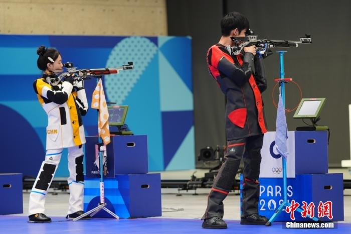 當(dāng)?shù)貢r(shí)間7月27日,在法國(guó)沙托魯舉行的巴黎奧運(yùn)會(huì)射擊10米氣步槍混合團(tuán)體決賽中,中國(guó)組合黃雨婷/盛李豪奪得金牌。圖為黃雨婷(左)/盛李豪在比賽中。中新社記者 趙文宇 攝
