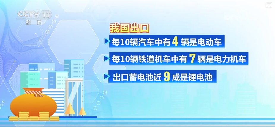 據(jù)海關(guān)統(tǒng)計,我國出口的每10輛汽車中有4輛是電動車,每10輛鐵道機車中有7輛是電力機車,出口蓄電池近九成是鋰電池,外貿(mào)出口的綠色屬性更強。