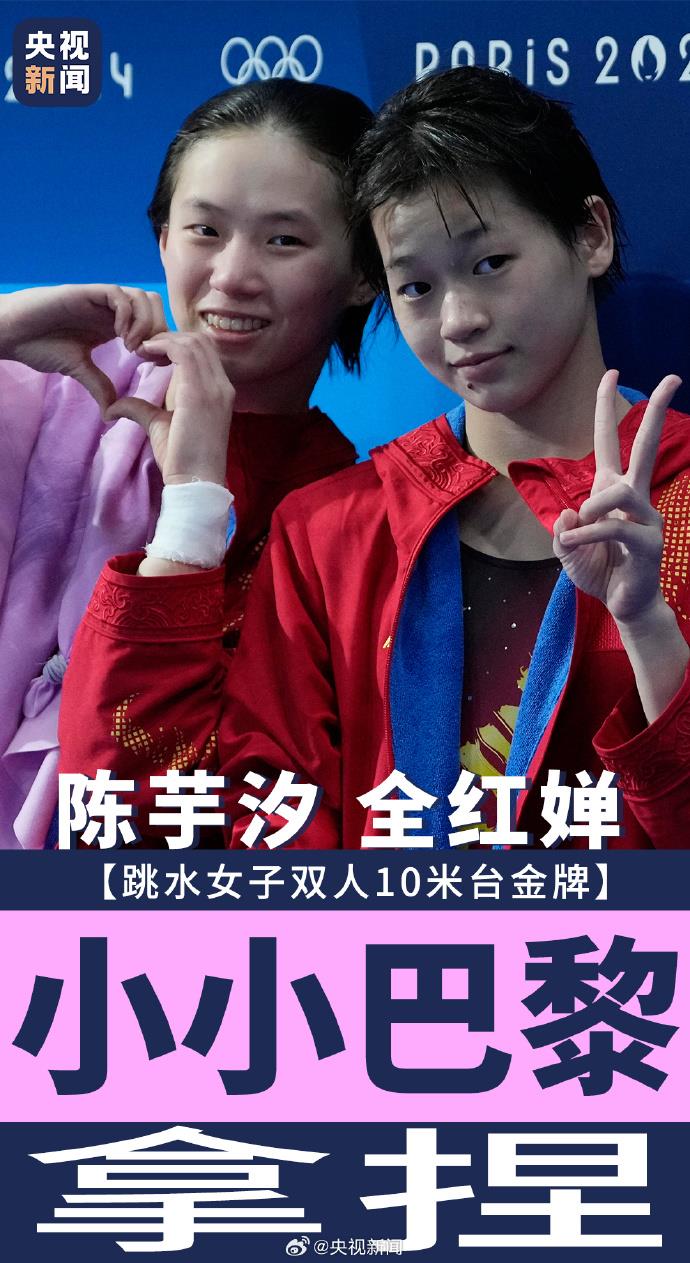 賽后,全紅嬋掛在陳芋汐身上退場時,復刻經典慶祝動作:“小小巴黎,拿捏!”