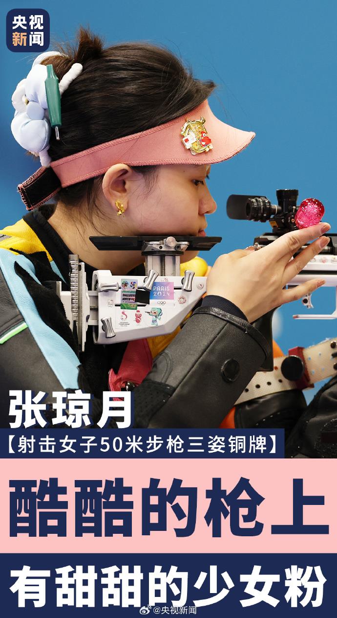 8月2日,在巴黎奧運會射擊女子50米步槍三姿決賽中,中國選手張瓊月奪得銅牌。戴著粉色帽子的張瓊月,步槍上貼滿可愛的Hello Kitty貼紙,用最萌的裝備打最穩(wěn)的槍!