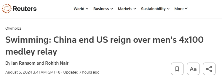 當(dāng)?shù)貢r間8月4日,在游泳男子4×100米混合泳接力中,中國隊反超該項目的奧運“霸主”美國隊以及東道主法國隊,以3分27秒46奪冠。英國路透社(Reuters)4日的報道中寫道,現(xiàn)場歡呼聲震耳欲聾,中國隊的奪冠結(jié)束了美國隊64年來的不敗紀(jì)錄。賽后,美國選手萊恩·墨菲(Ryan Murphy)說:“今天中國隊的表現(xiàn)比我們要更好一些,向中國隊致敬,他們今晚的表現(xiàn)非常出色?!绷硪幻绹x手亨特·阿姆斯特朗(Hunter Armstrong)則關(guān)注到當(dāng)天是中國選手潘展樂的生日,他表示:“這對他來說會是一份很酷的生日禮物!”