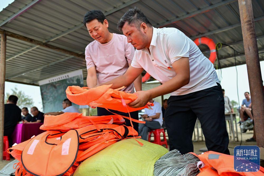 ↑在新疆阿克蘇地區(qū)沙雅縣蓋孜庫木鄉(xiāng)吐央村,搶險(xiǎn)人員在整理防汛物資(8月3日攝)。
