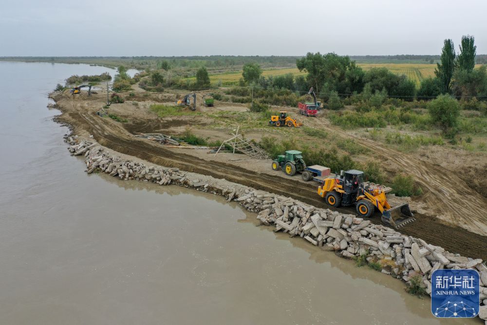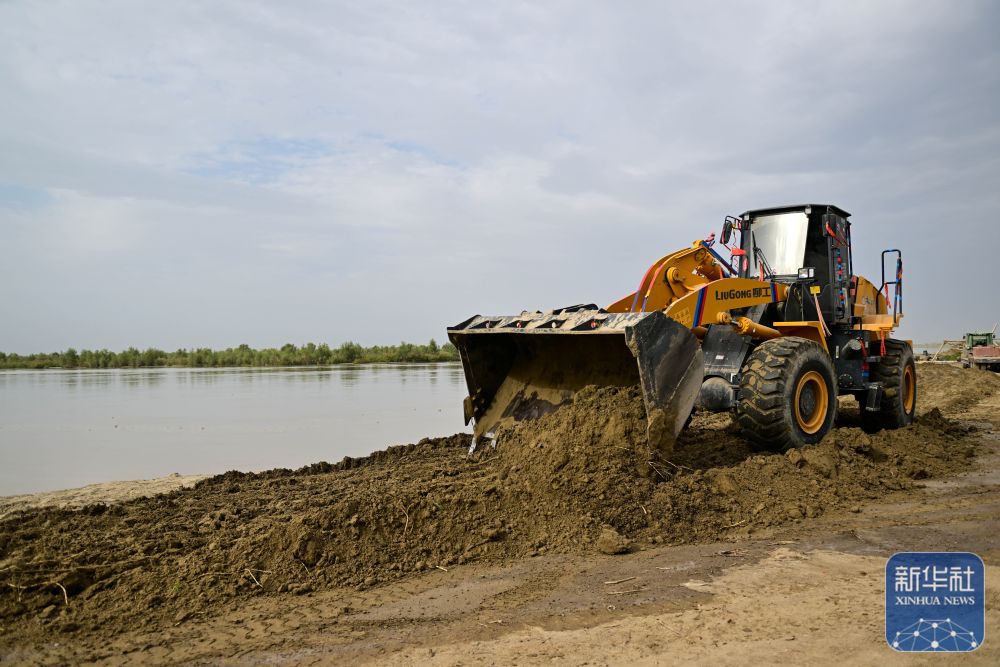 ↑在新疆阿克蘇地區(qū)沙雅縣蓋孜庫木鄉(xiāng)吐央村,搶險(xiǎn)人員駕駛大型機(jī)械進(jìn)行堤壩加固(8月3日攝)。