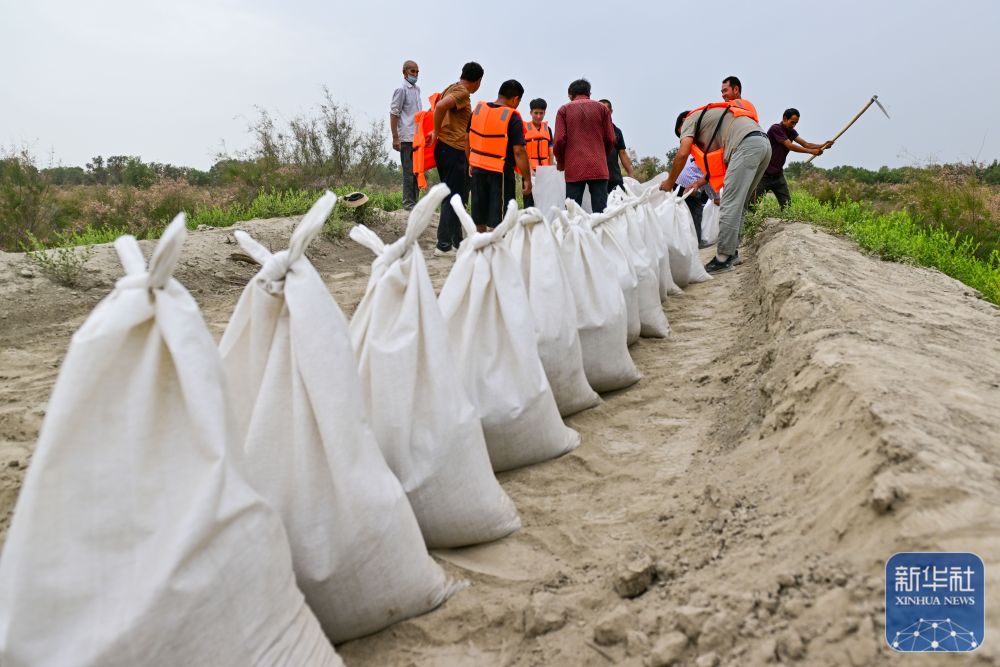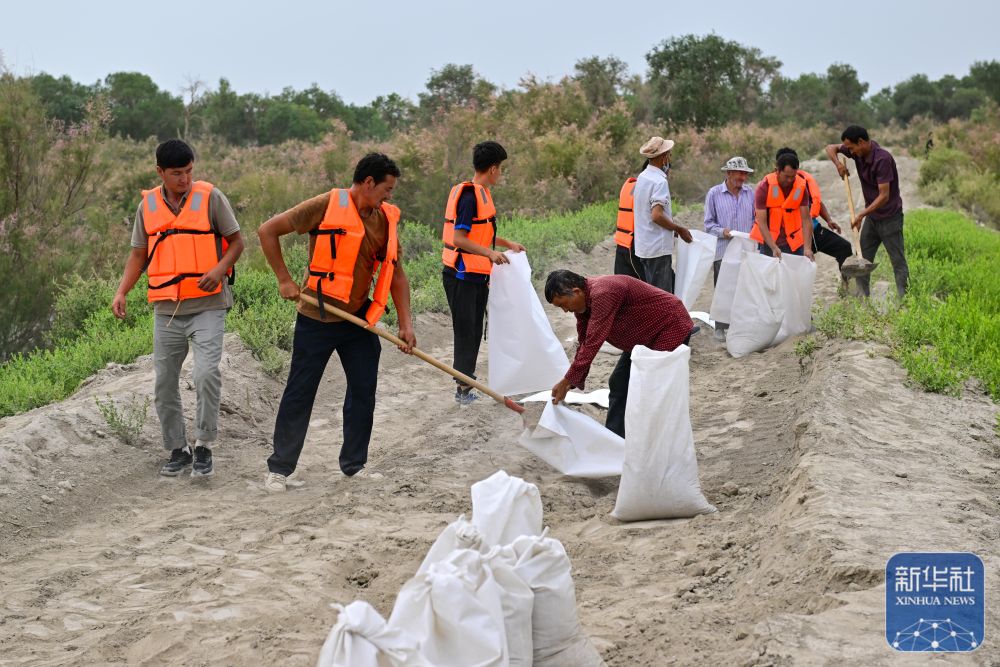 ↑在新疆阿克蘇地區(qū)沙雅縣蓋孜庫木鄉(xiāng)一處河堤除險(xiǎn)加固現(xiàn)場,搶險(xiǎn)人員在裝運(yùn)沙袋(8月3日攝)。