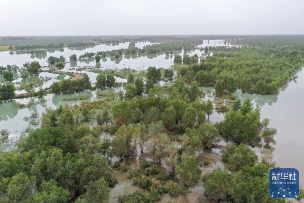 ↑8月1日拍攝的利用塔里木河洪水灌溉阿克蘇地區(qū)沙雅縣天然胡楊林的場景(無人機(jī)照片)。